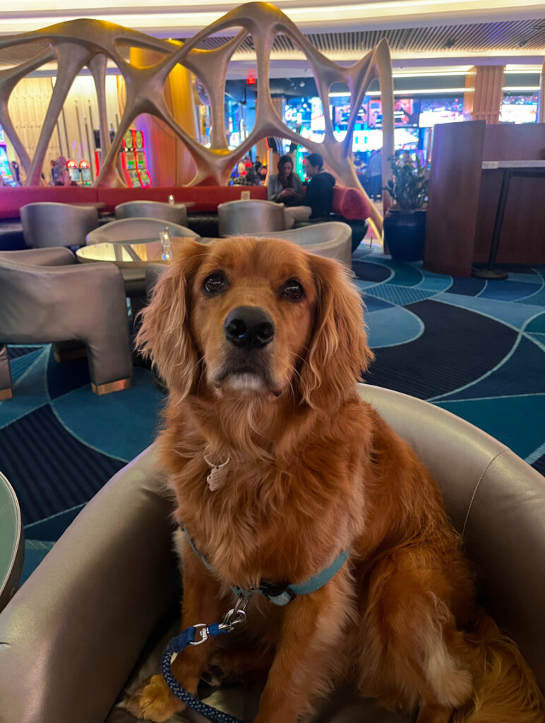 And then, the casino. Oh, the casino! Tank couldn’t hit the blackjack table—something about paws on the table and the inability to hold cards due to the fact that he has no thumbs—but he didn’t need to. With his wagging tail and irresistible charm, he was the unofficial good-luck charm of the night. Dealers, players, even passersby couldn’t resist giving him a quick pet. Tank soaked it all in, basking in the glow of his fan club like the king of the casino floor.