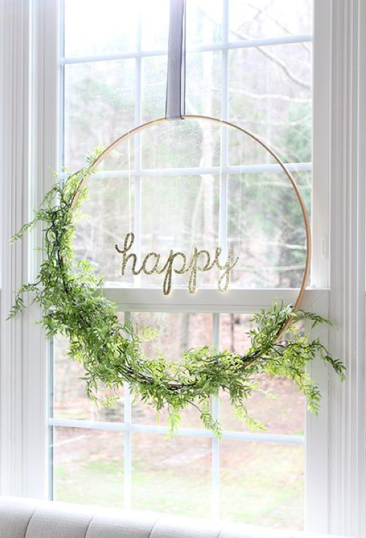 These hoops are available at Michaels. Add any type of greenery to the perimeter of it covering 1/2 – 2/3 of the hoop. Using clear thread or some fishing line hang any type of sign that resonates with you from the top of it so that it hangs in the middle of the ring.